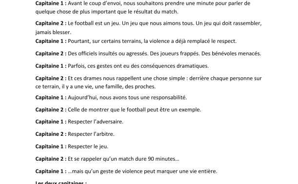 Cette semaine, l’ensemble du territoire Méditerranéen est engagé dans une action forte de lutte contre la violence. Dans cette dynamique, la Ligue a décidé que le protocole appliqué sur les rencontres Régionale serait également mis en place sur les matchs de niveau District. Ainsi, pour les rencontres de ce week-end, le District des Alpes demande à chaque arbitre de faire lire la Charte du Respect aux capitaines avant le coup d’envoi.
